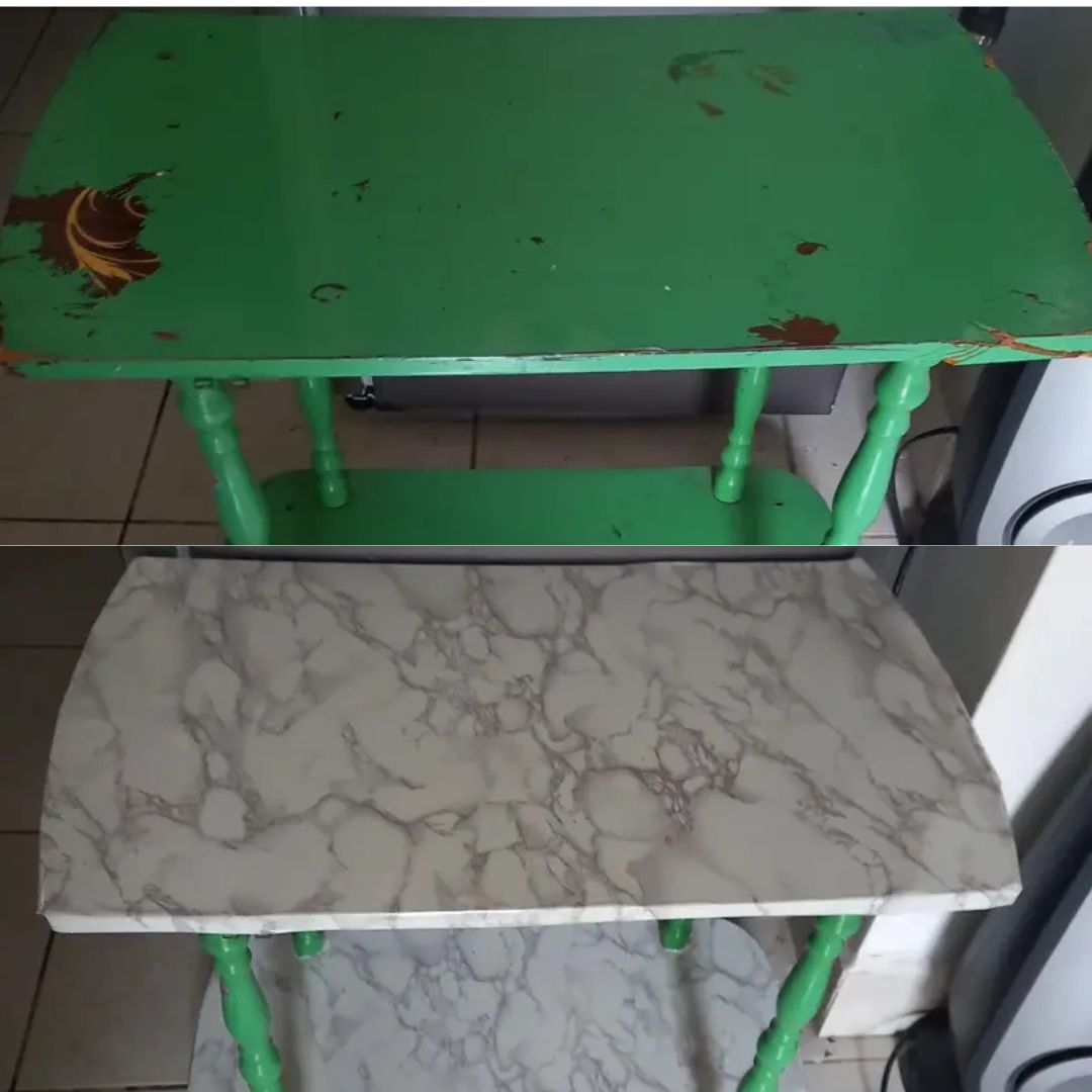 Tenía una mesa vieja que ya pensaba botar, pero la forré con este vinilo y quedó como nueva. El diseño de mármol le dio un toque moderno. Me ahorré plata y me encantó el resultado.